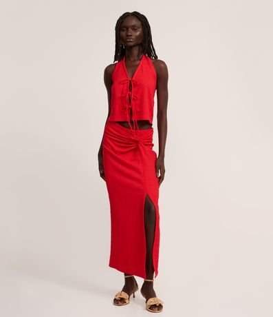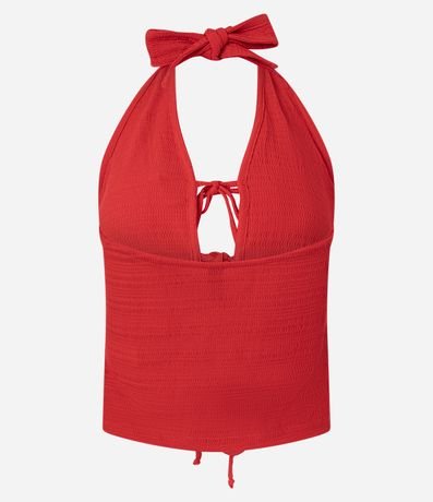 Ref: Blusa feminina confeccionada em poliéster através de boas práticas ambientais, no modelo frente única. Possui decote V, amarrações e texturizada.