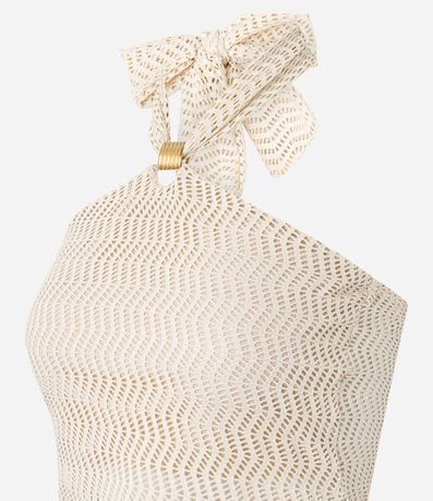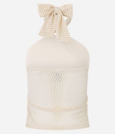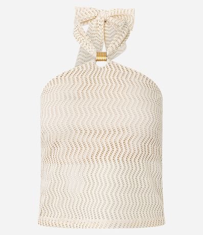 Ref: Blusa feminina com frente única, detalhe de aviamento, amarração no pescoço e textura.