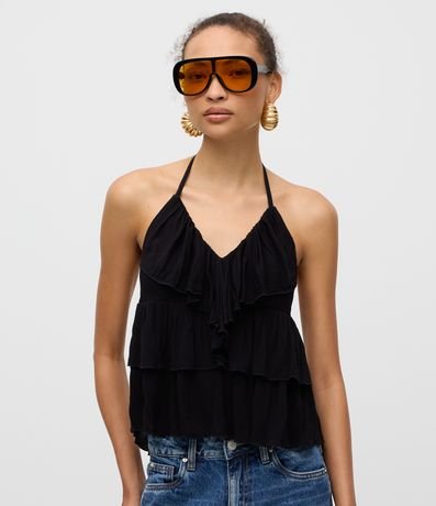Blusa feminina frente única com amarração no pescoço, confeccionada em viscose certificada. Possui decote em v, camadas fluídas e babados que criam volume e movimento. O design soltinho oferece conforto e um visual delicado.