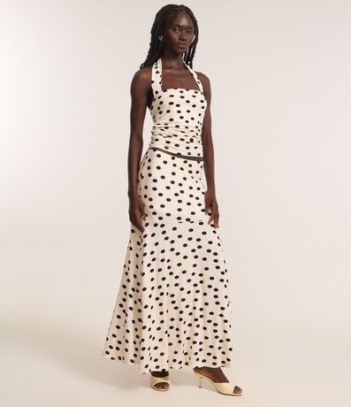Blusa feminina confeccionada em viscose certificada com boas práticas ambientais, peça com frente única, decote reto, estampa poá e franzidos laterais.