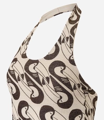 Blusa feminina frente única confeccionada em viscose mais sustentável, possui tecido com fio metalizado, garantindo brilho e sofisticação. Possui estampa gravataria em fullprint, modelagem curta e sem mangas. Ideal para compor looks modernos e elegantes com toque fashion e sustentável.