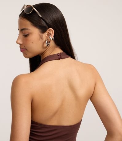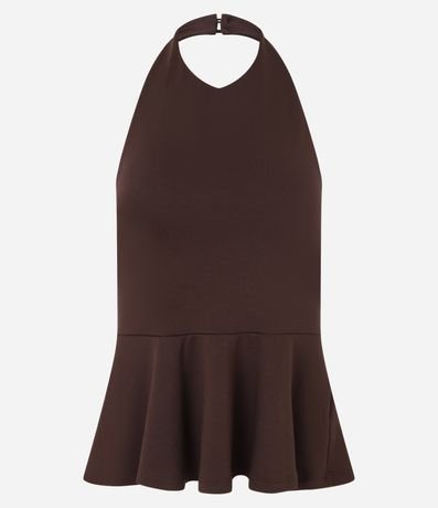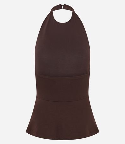 Ref: Blusa feminina frente única. Possui corte acinturado com abertura em peplum a partir da linha da cintura. As costas são abertas e conta com fechamento na nuca por dois botões revestidos.