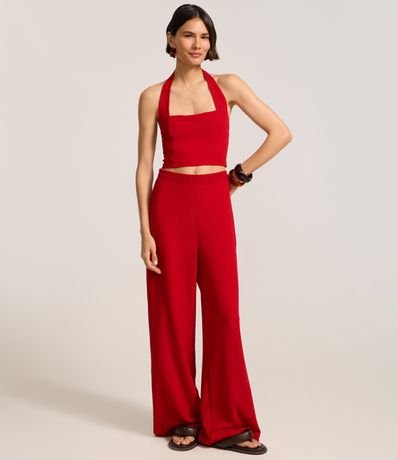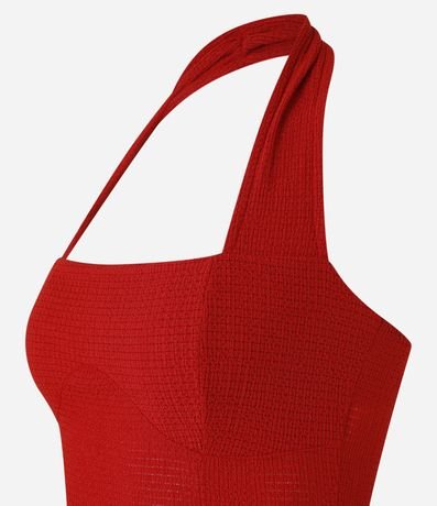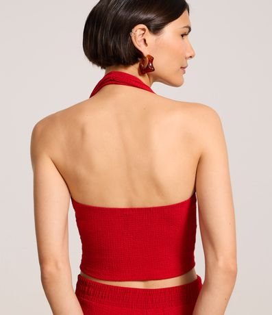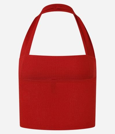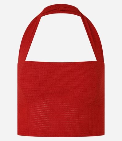 Blusa confeccionada em tecido texturizado e sem estampa. A peça tem as costas abertas, alça ao redor do pescoço e estrutura corsetada.