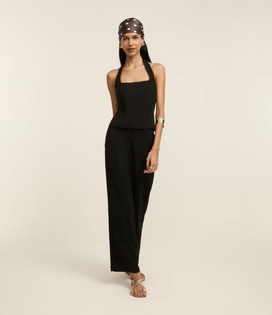 Ref: Blusa feminina confeccionada em crepe, de modelo frente única e curto, com decote reto e sem estampa.