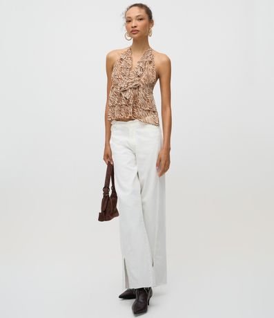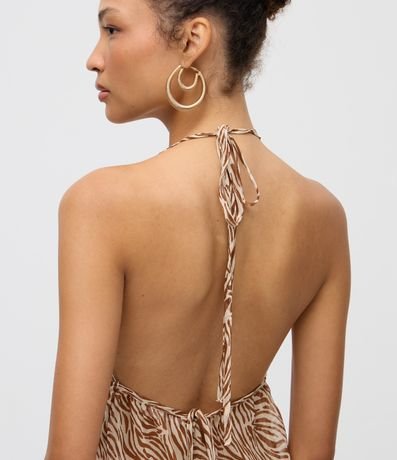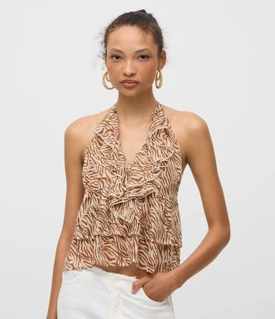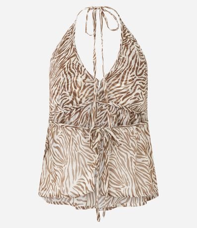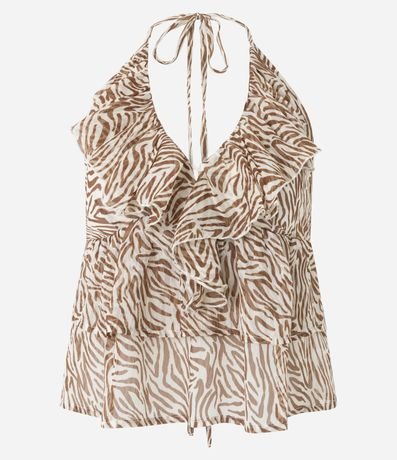 Ref: Blusa feminina confeccionada em chiffon, com decote frente única e babadinho no peito. Possui amarração no pescoço, corte soltinho e padronagem animal print de zebra.