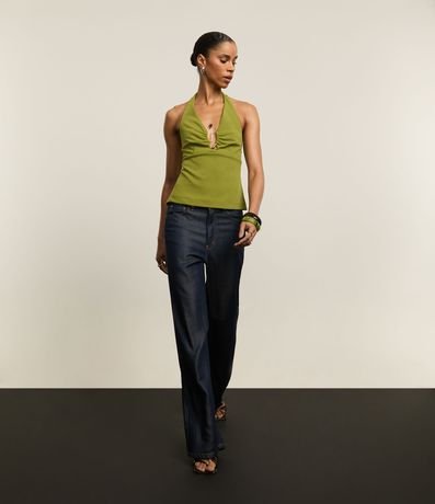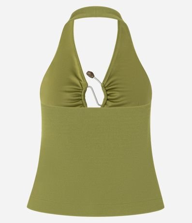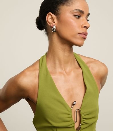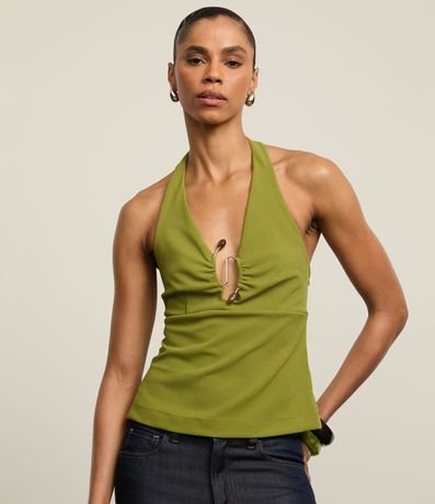 Ref: Blusa frente única, confeccionado em crepe, com recorte no busto. A peça tem detalhe metalizado com pedras artificiais no busto que confere efeito franzido.