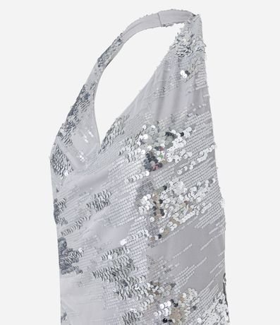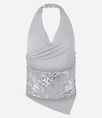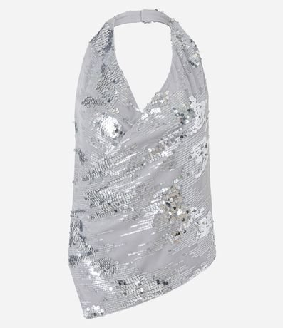 Blusa frente única confeccionada em malha com paetês. Possui decote V e barra assimétrica.