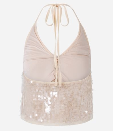 Ref: Blusa feminina confeccionada em poliamida mais sustentável, no modelo frente única. Possui decote v, amarração, paetês e babados.