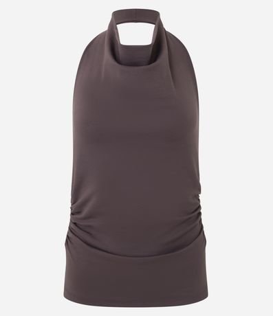 Blusa feminina de modelo frente única, confeccionada em ponto roma, com decote degagê e franzidos laterais.