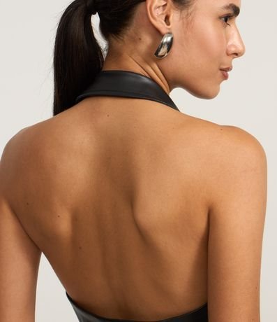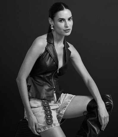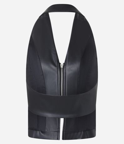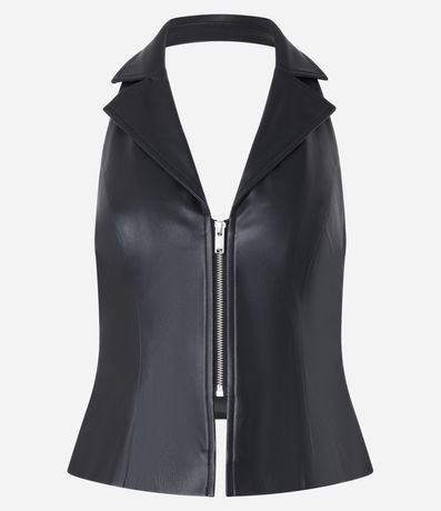 Blusa frente única, estilo coletinho, confeccionada em material sintético, pu, zíper tratorado frontal e com costas abertas.