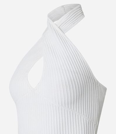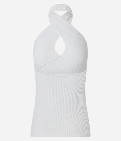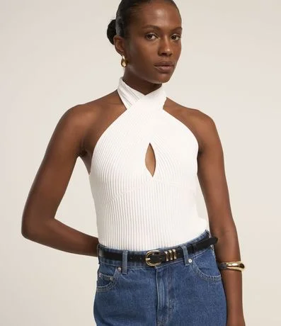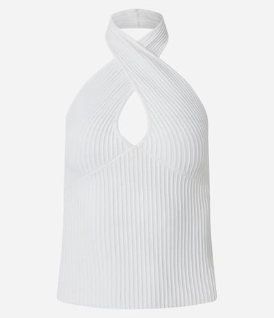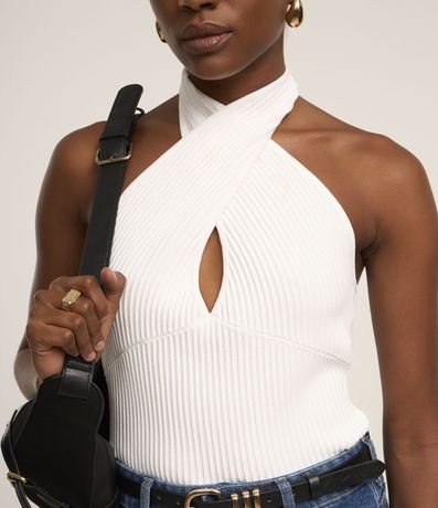 Blusa frente única em tricô leve canelado com decote transpassado com abertura vazada no busto.