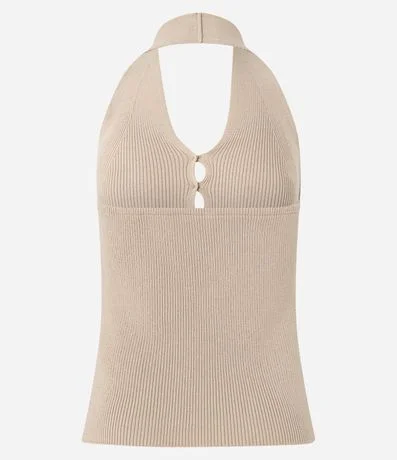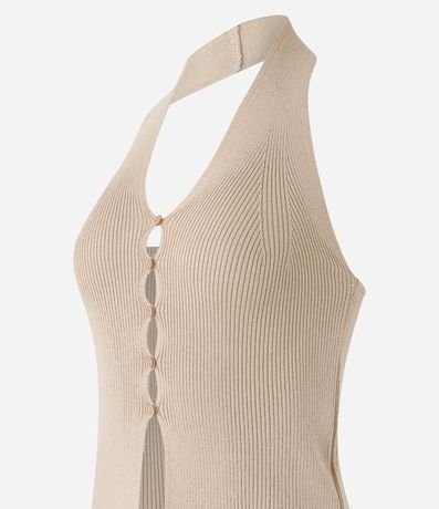 Ref: Blusa frente única, sem manga, confeccionada em tricô e com botões frontais.
