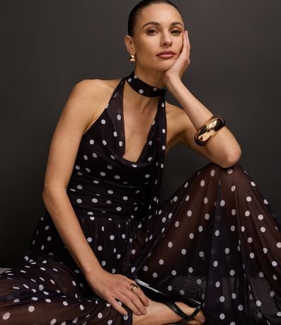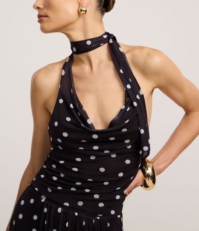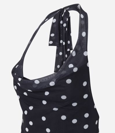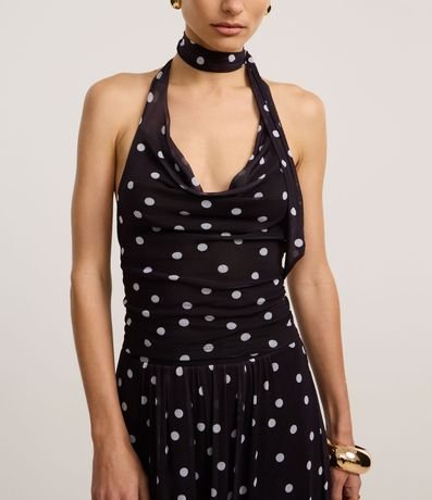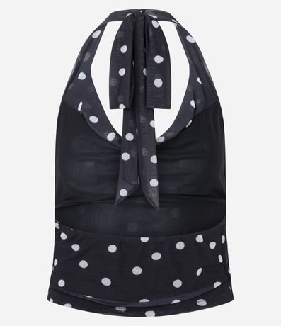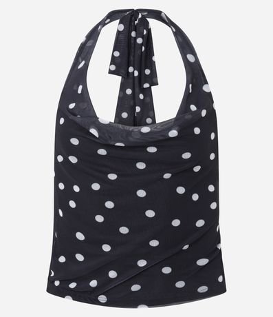 Ref: Blusa feminina confeccionada em tule, no modelo frente única, com decote degagê, lenço no pescoço e estampa poá.