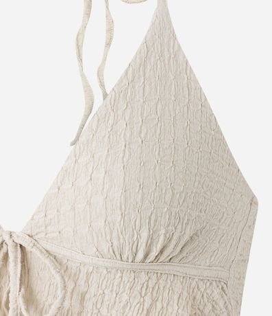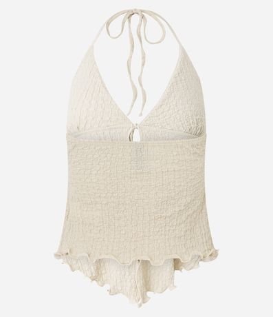 Blusa texturizada de frente única com decote V, amarração no pescoço e nas costas. Possui parte do abdômen dividida e barra nuvem.