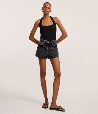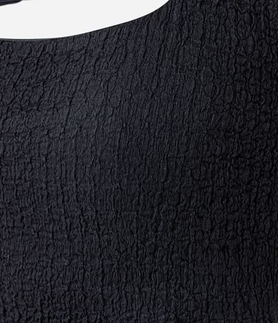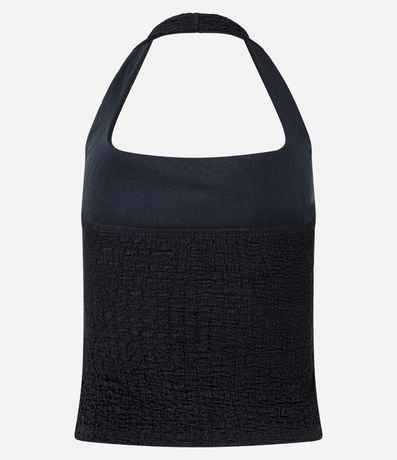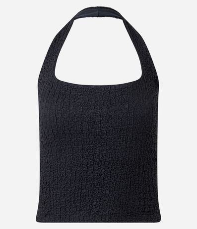 Ref: Blusa feminina sem manga confeccionada em poliéster. Possui alças largas que prendem no pescoço, deixando os ombros e costas em evidência, corte justo e textura tipo enrugado.