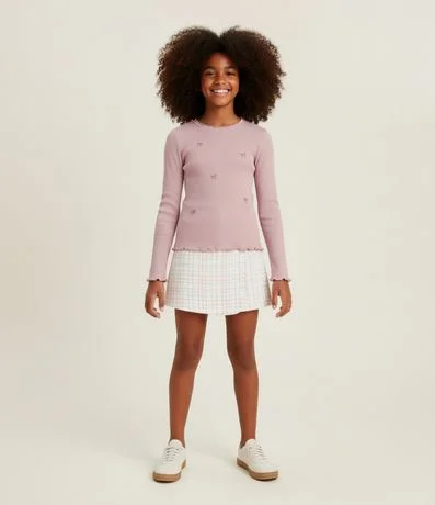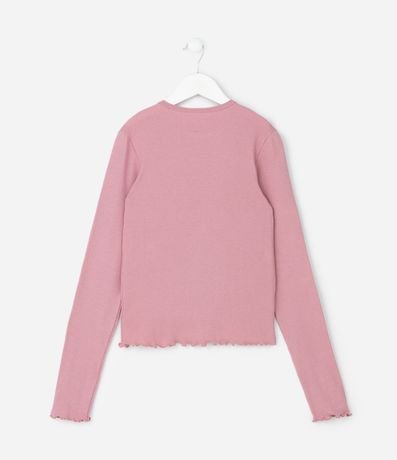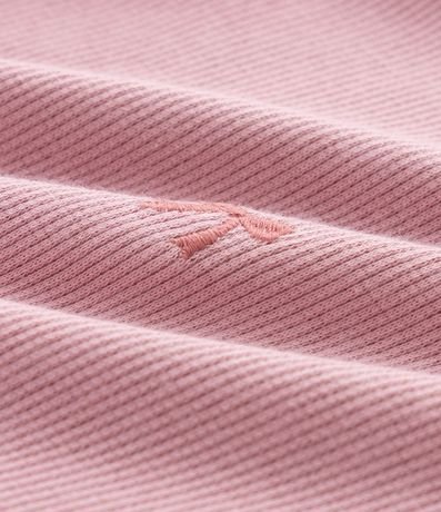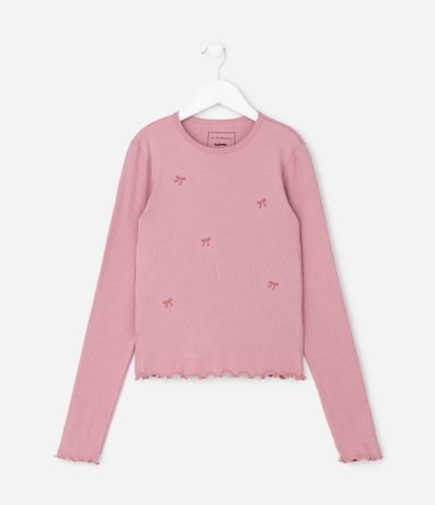 Blusa infantil modelo baby look confeccionada em algodão certificado BCI, com superfície canelada e toque macio. Possui gola redonda, mangas longas e mini lacinhos em puff aplicados. A barra e os punhos com acabamento ondulado completam o visual moderno.