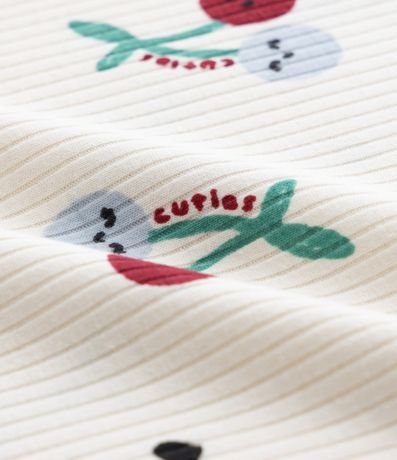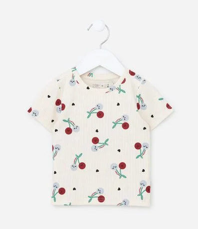 Blusinha infantil com textura canelada, gola redonda, mangas curtas e estampa de cerejinhas delicadas.