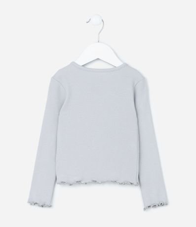 Blusa infantil confeccionada em algodão de material e processo mais sustentáveis. Possui gola redonda, manga longa, textura canelada, frufru nas bordas e estampa de coraçõezinhos.
