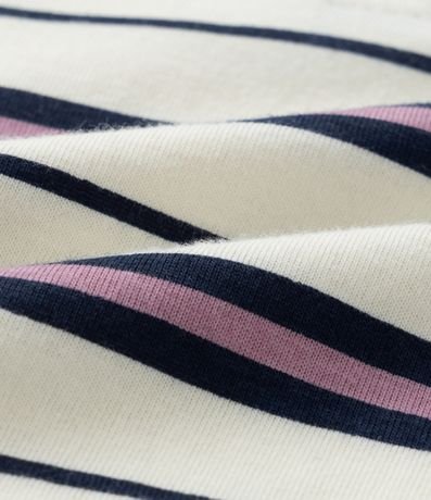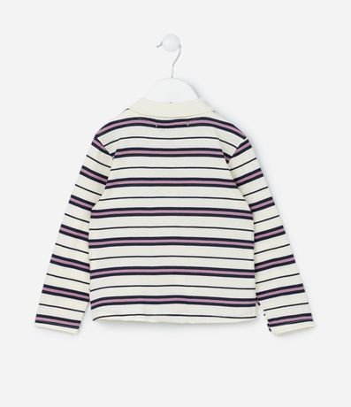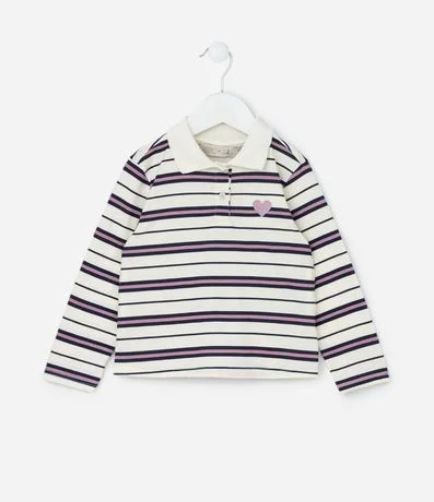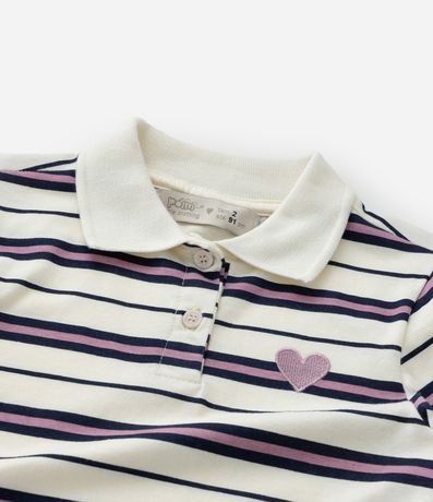 Camiseta infantil com gola polo, mangas longas e bordado de coração no peito, com fundo listradinho. A peça é confeccionada com boas práticas ambientais e algodão certificado bci.