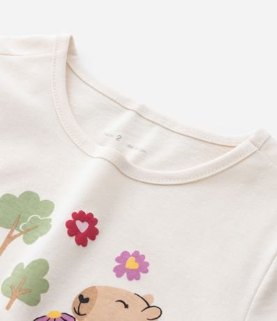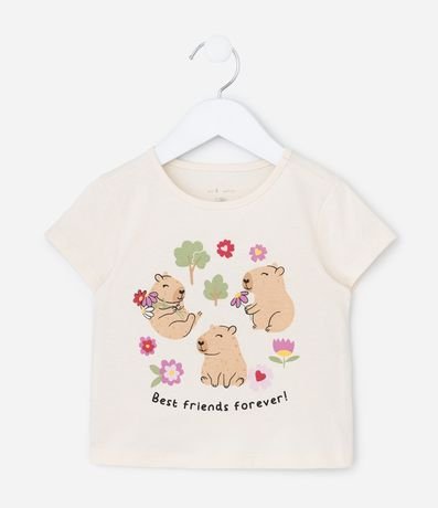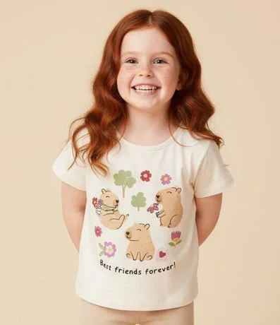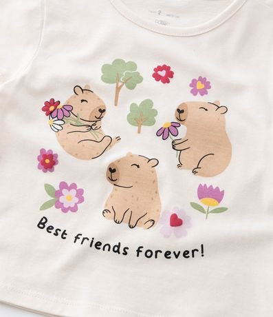Ref: Blusa infantil confeccionada em algodão mais sustentável. Possui gola redonda, manga curta, estampa de capivaras e lettering "Best friends forever!".