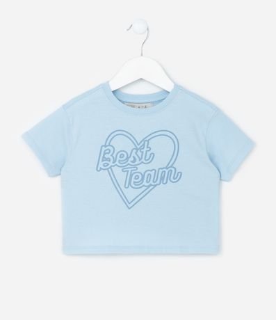 Ref: Blusa infantil confeccionada em algodão mais sustentável através de boas práticas ambientais. Possui gola redonda, manga curta, estampa de coração e lettering "Best team".