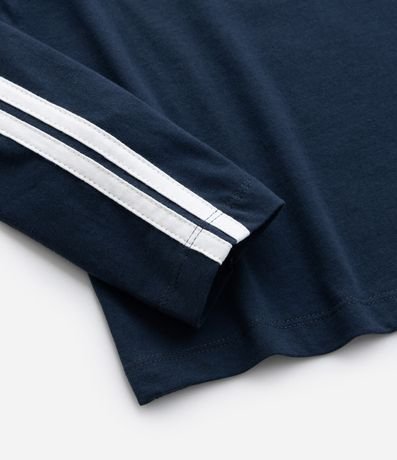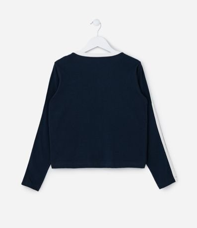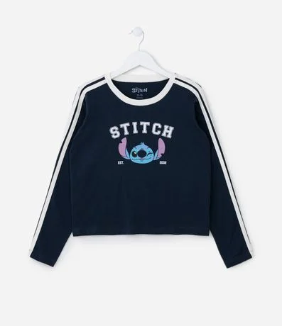 Ref: Blusa infantil com gola redonda, manga longa com listras e estampa do Stitch. A peça é confeccionada com boas práticas ambientais e algodão certificado bci.