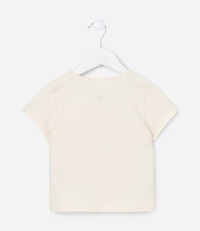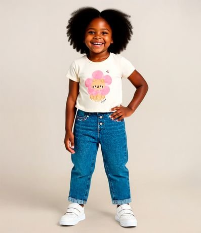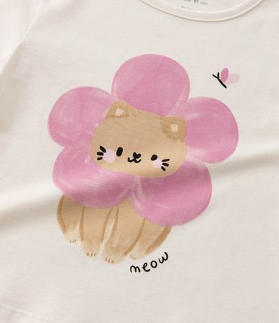 Ref: Blusa infantil confeccionada em algodão, com gola redonda, mangas curtas e estampa de gatinho com florzinha.