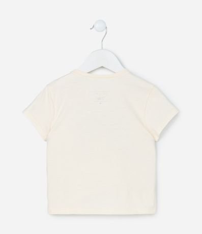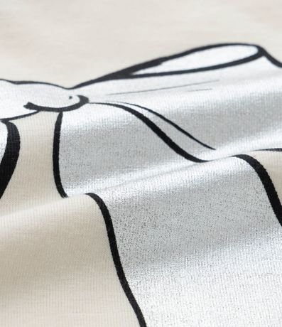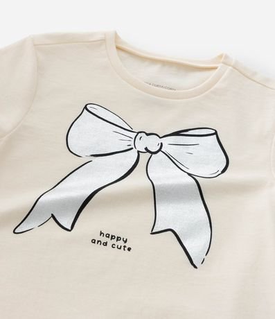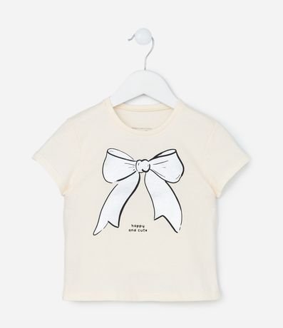 Ref: Blusa infantil com gola redonda, mangas curtas e estampa de laço. O item é confeccionado com boas práticas ambientais e algodão certificado bci.