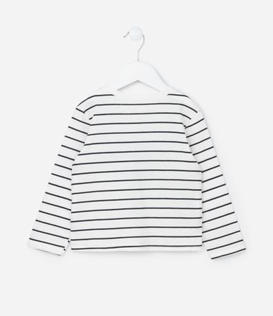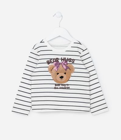 Blusa infantil confeccioanda em algodão, com golinha redonda, manga longa e estampa listradinha com ursinha e lettering "Bear hugs".