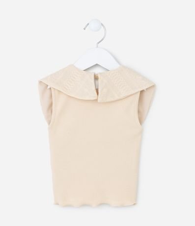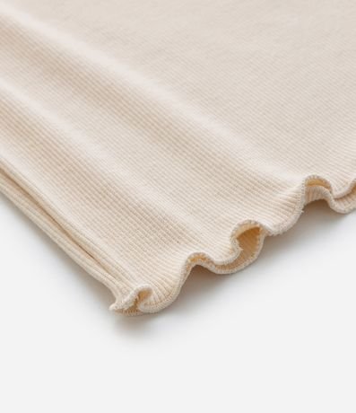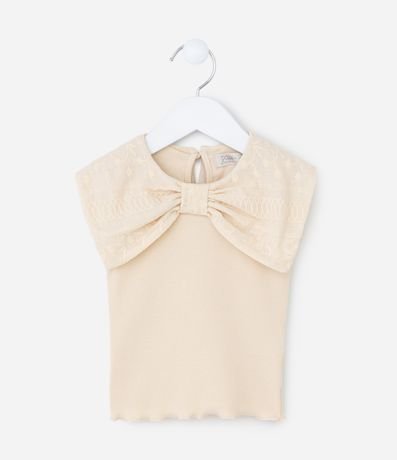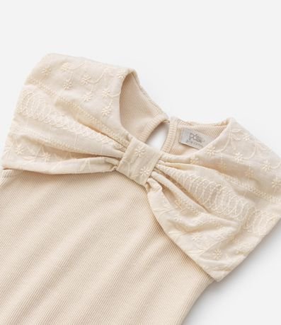 Ref: Blusa infantil confeccionada em ribana caneladinha, feita a partir de material e processos mais sustentáveis. Possui gola redonda com laço grande texturizado, sem mangas, frufru na barra e fechamento nas costas por gota.