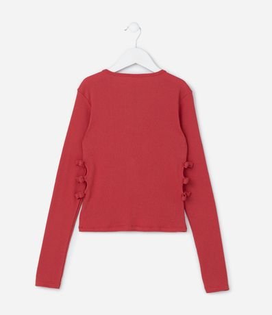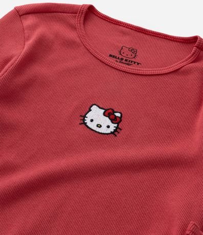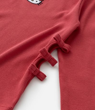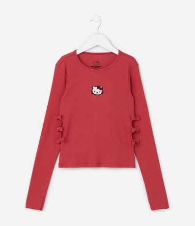 Ref: Blusa infantil confeccionada em material e processo mais sustentável. Com gola redonda, manga longa, canelada, com recortes e lacinhos aplicados, além de um bordadinho Hello Kitty.
