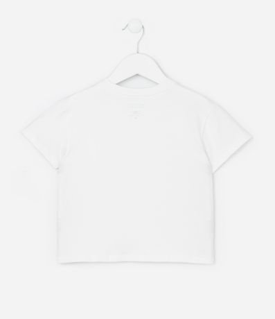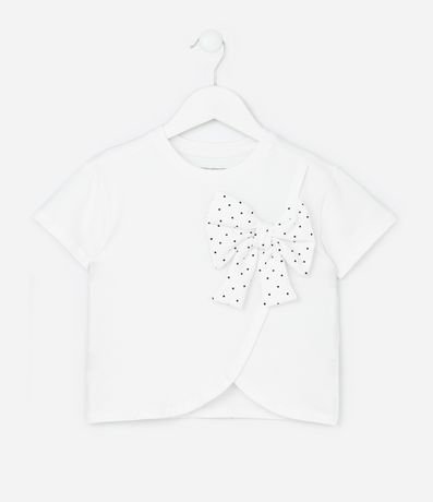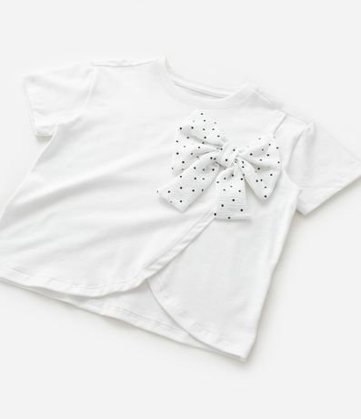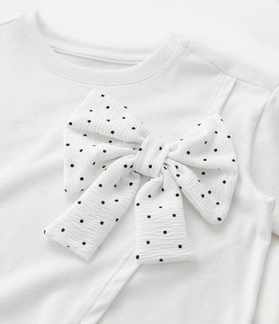 Ref: Blusa infantil confeccionada em anarruga mais sustentável. Possui gola redonda, manga curta, laço poá aplicado e barra assimétrica.