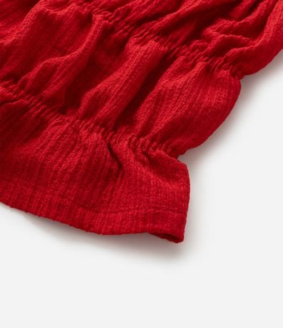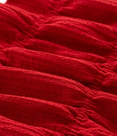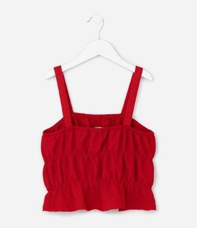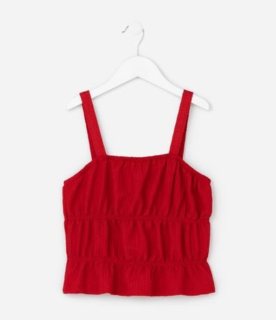 Ref: Blusa infantil confeccionada em anarruga através de boas práticas ambientais. Possui decote quadrado, alcinhas, detalhes em lastex e texturizada.