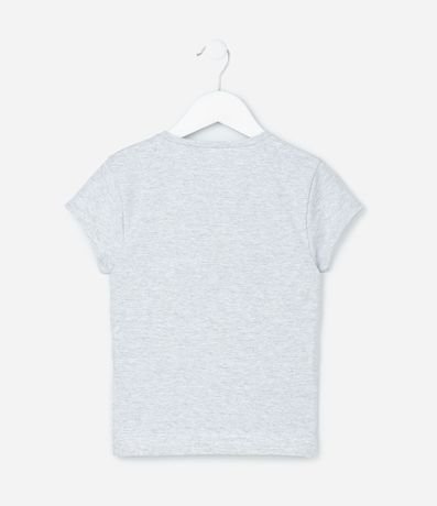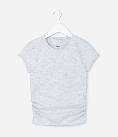 Blusinha infantil confeccionada em malha de algodão mais responsável, sem estampa, com gola redonda, mangas curtas e detalhe drapeado nas laterais.