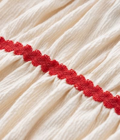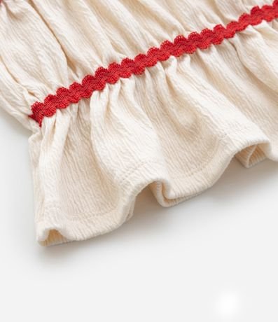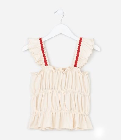 Ref: Blusa infantil confeccionada em anarruga através de boas práticas ambientais. Possui alças largas, decote quadrado, aplicação de sianinha, babadinhos e texturizado.