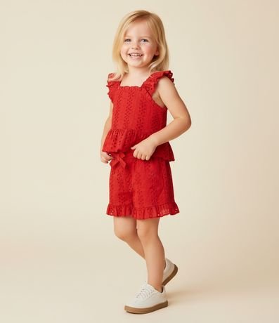 Ref: Blusa infantil confeccionada em laise mais sustentável. Possui decote quadrado, alças largas, babadinho na barra e textura de florzinhas.