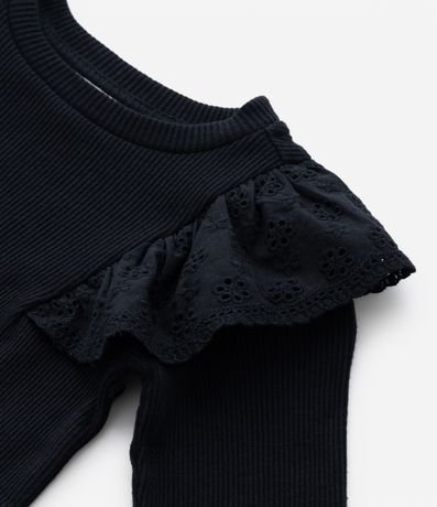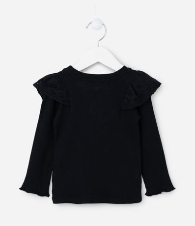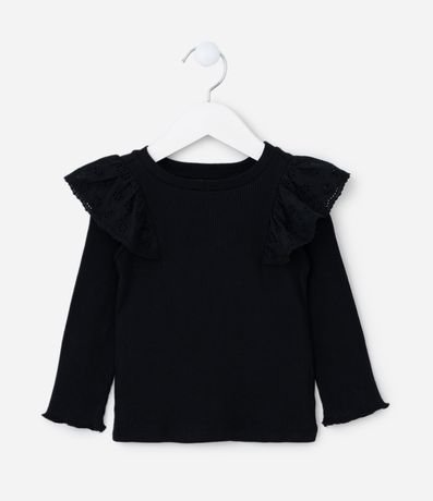 Blusa infantil confeccionada em ribana, com gola redonda, mangas longas e babadinhos em broderie nas cavas.