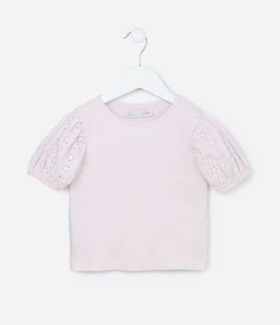 Ref: Blusa infantil confeccionada em ribana canelada, de material mais sustentável. Possui gola redonda e mangas com textura em borderie.