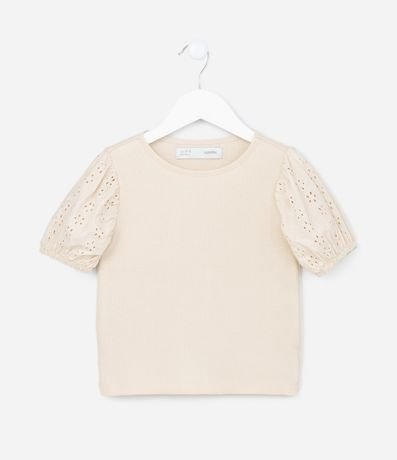 Ref: Blusa infantil confeccionada em ribana canelada, de material mais sustentável. Possui gola redonda e mangas com textura em borderie.