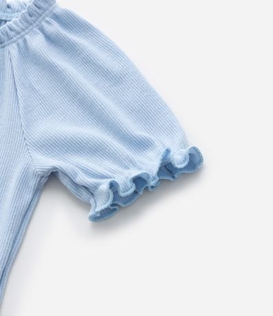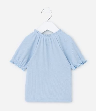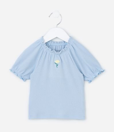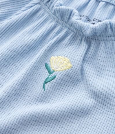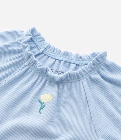 Ref: Blusa infantil confeccionada em ribana canelada, de material mais sustentável. Possui gola redonda com elástico, mangas curtas bufantes e bordadinho de flor no peito.