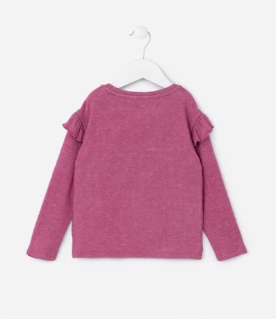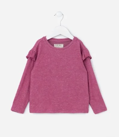 Blusinha infantil confeccionada em tricô, com gola redonda, manga longa e detalhe de babadinhos nos ombros.