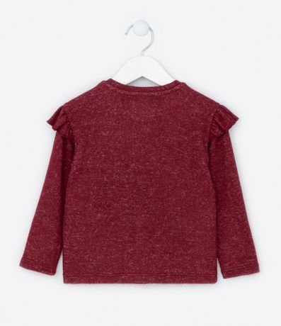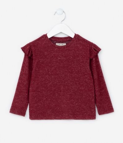Blusinha infantil confeccionada em tricô, com gola redonda, manga longa e detalhe de babadinhos nos ombros.