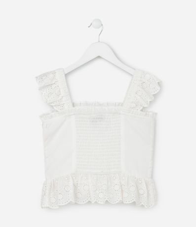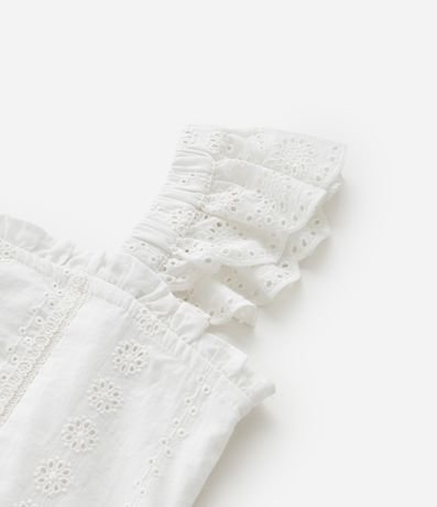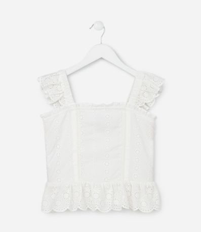 Ref: Blusa infantil confeccionada em tricoline mais sustentável. Possui decote quadrado, alcinhas com broderie, lastex nas costas e babadinho na barra.