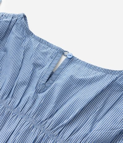 Blusa infantil confeccionada em tricoline mais sustentável. Possui gola redonda, abotoamento gota, cavas, estampa de listras, detalhes com preguinhas e amarrações.