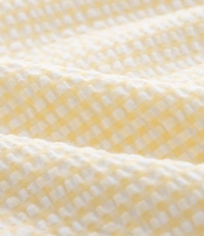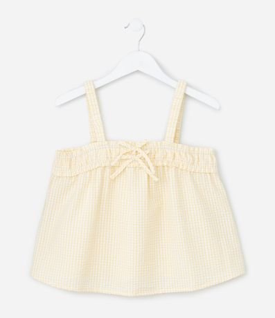 Blusa infantil confeccionada em tricoline mais sustentável. Possui decote quadrado, com lacinhos, alcinhas, estampa xadrez vichy e texturizada.