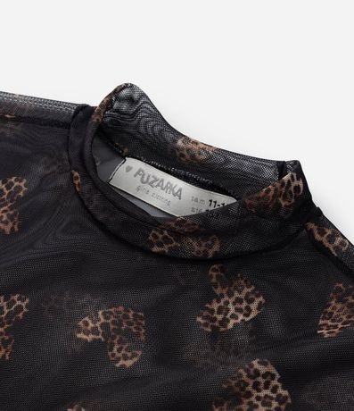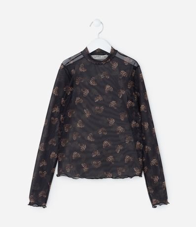 Blusa infantil em tule, com mangas longas, frufru nas bordas e estampa de corações. Possui também uma blusinha interna com alças finas que vai fazer um lookinho ainda mais estiloso! A peça interna é confeccionada com boas práticas ambientais e algodão certificado bci.