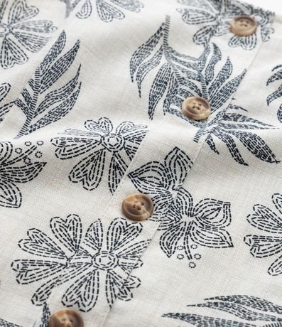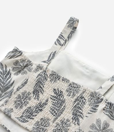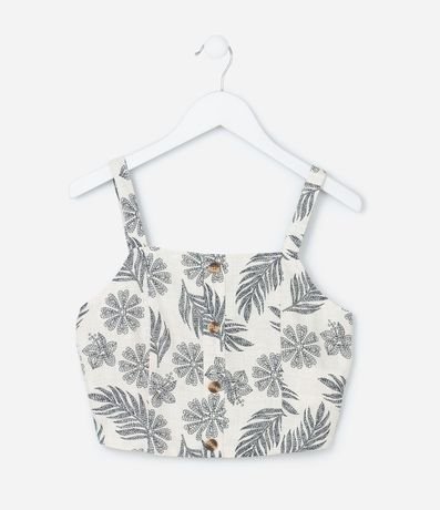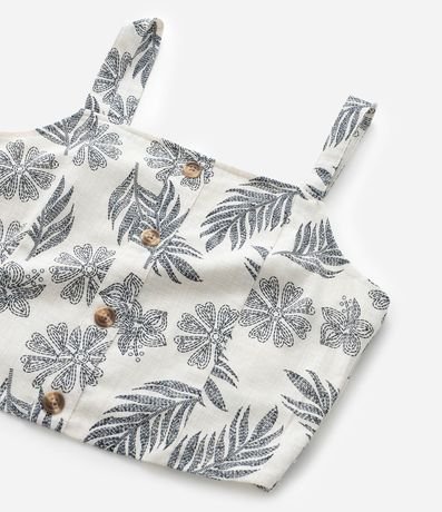 Ref: Blusa infantil confeccionada em viscose e linho, de material mais sustentável. Possui alças médias, botões frontais, elástico nas costas e estampa de folhagens.