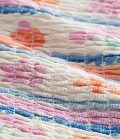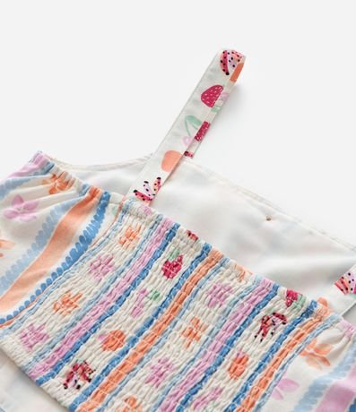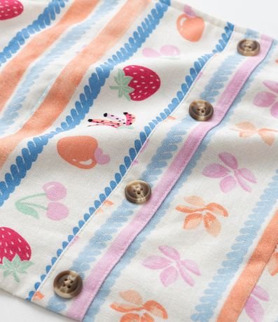 Ref: Blusa infantil confeccionada em viscose e linho, de material mais sustentável. Possui alças médias, botões frontais, elástico nas costas e estampa de listras e frutas.