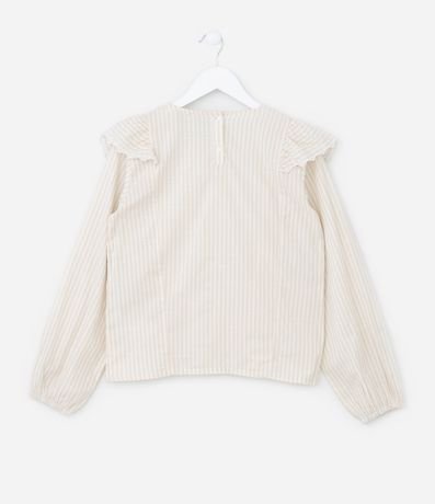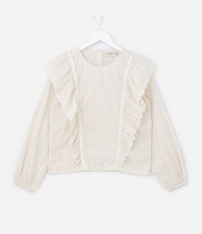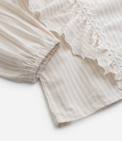 Ref: Blusa infantil confeccionada em viscose, com gola redonda e manga longa bufante. Possui estampa de listras, babados frontais com broderie e abertura com botões nas costas.