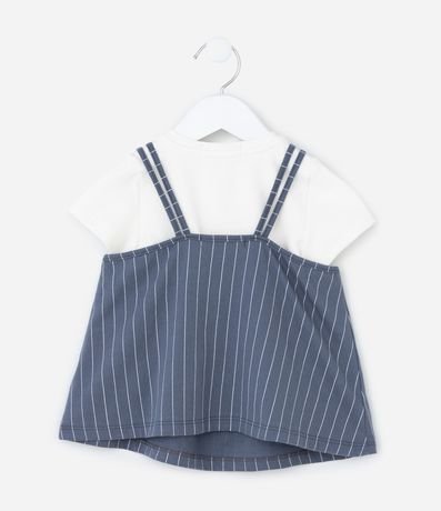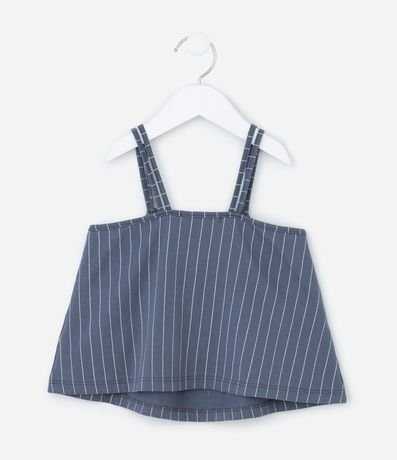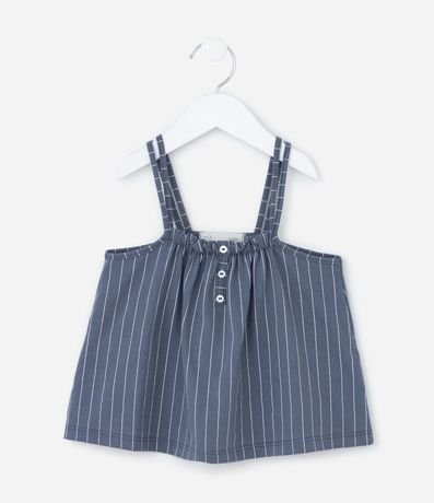Ref: Blusa infantil de alças duplas finas, com detalhe de botões no decote e estampa risca de giz. Acompanha blusinha interna de mangas curtas e textura canelada. A peça é confeccionada com boas práticas ambientais e algodão certificado bci.